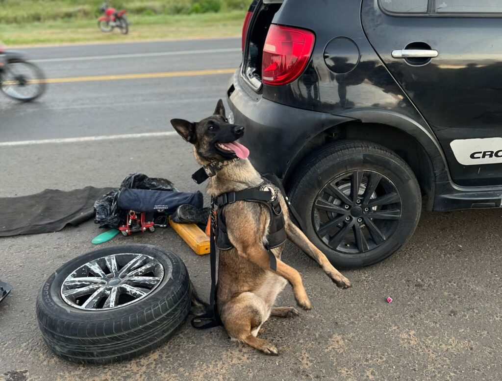 La intervención del can antinarcóticos “Mali” resultó determinante para avanzar en la inspección. El animal realizó una marcación positiva en el sector del baúl del vehículo, lo que confirmó las sospechas iniciales del personal policial y permitió profundizar el procedimiento.