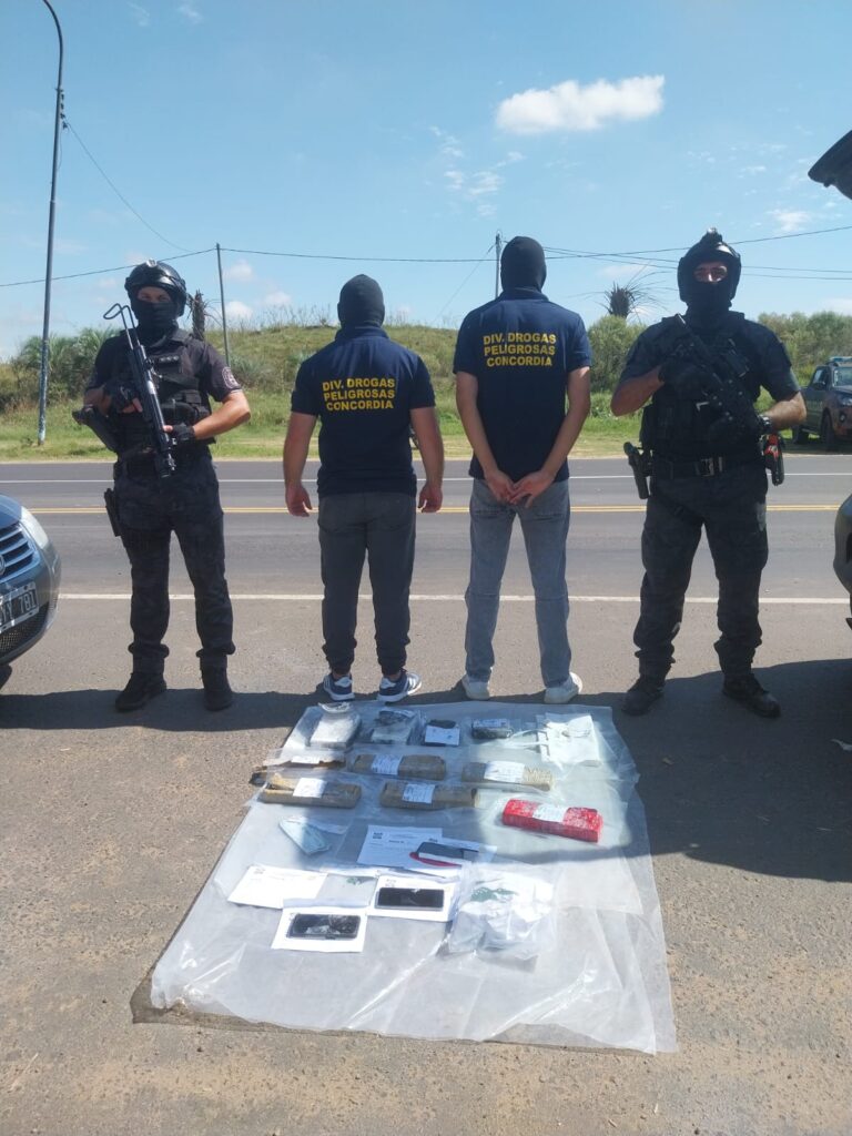 Un operativo policial realizado en Concordia este 27 de marzo, sobre la avenida Presidente Perón frente al Parque Industrial, permitió detener a dos personas y secuestrar más de 7 kilos de estupefacientes que eran trasladados desde la provincia de Buenos Aires, en el marco de una causa por infracción a la Ley Nacional N° 23.737.