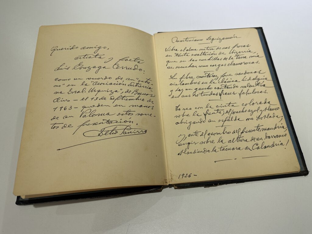 La entrega fue recibida por María del Carmen Petrone, coordinadora de los Museos Municipales, en representación de la comunidad uruguayense. El cuaderno contiene una serie de sonetos únicos bajo el título: “Para el Montaraz de Martiniano Leguizamón en las ilustraciones de Luis Gonzaga Cerrudo”. Allí Panizza incluyó un poema sobre Leguizamón, catorce sonetos inspirados en las tintas realizadas por Cerrudo y tres composiciones dedicadas a la Trilogía Telúrica (Matrero, Estirpe y El gavilán y la paloma).