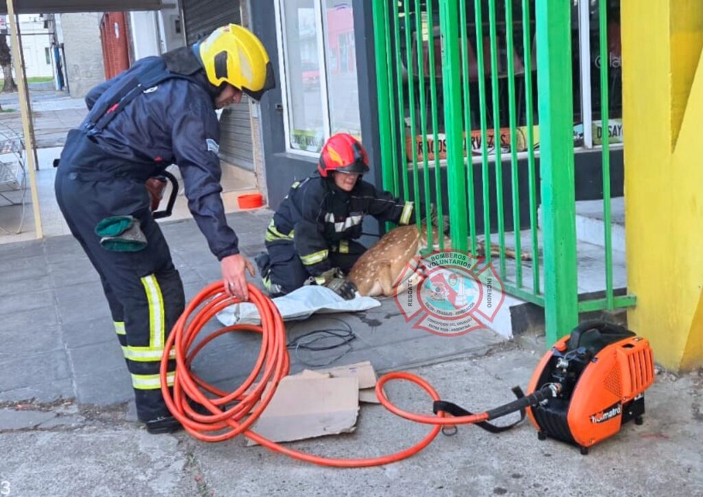 Vecinos alertaron esta mañana sobre un ciervo atrapado en un local deportivo ubicado en la intersección de 9 de Julio y Boulevard Díaz Vélez, en Concepción del Uruguay. Personal municipal y de seguridad actuó rápidamente para asegurar al animal y garantizar su integridad.