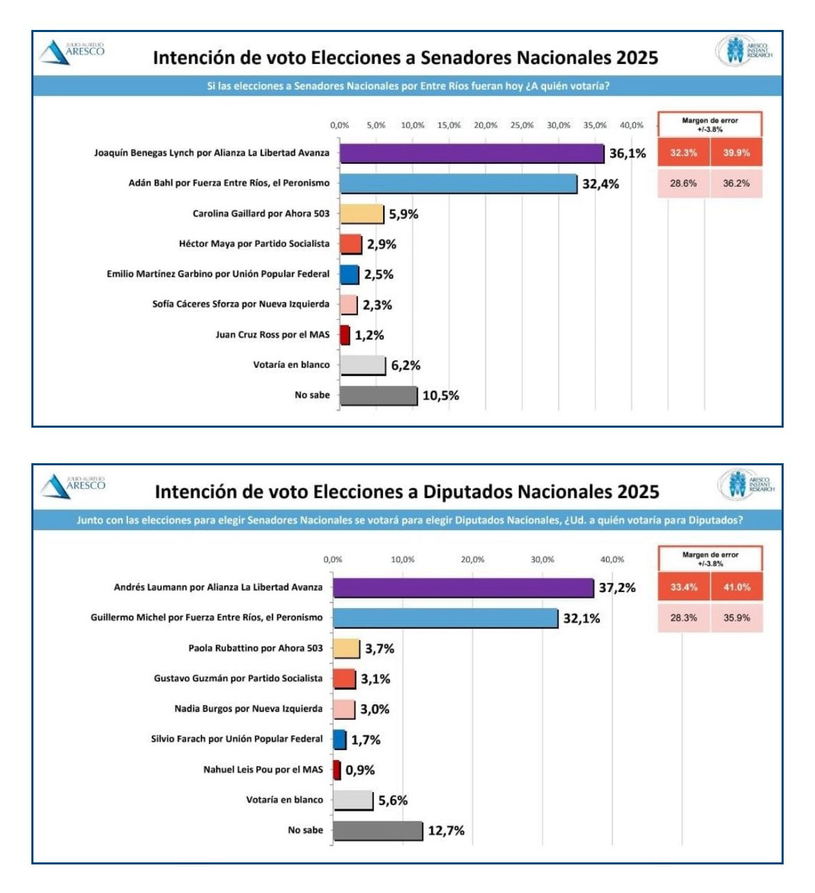 El sondeo indicó que Benegas Lynch alcanza el 36,1% en la categoría senadores, mientras que Adán Bahl registra 32,4%. Carolina Gaillard aparece con 5,9%, Héctor Maya con 2,9%, Emilio Martínez Garbino con 2,5%, Sofía Cáceres Sforza con 2,3% y Juan Cruz Ross con 1,2%. El 6,2% de los consultados votaría en blanco y un 10,5% todavía no definió su postura.