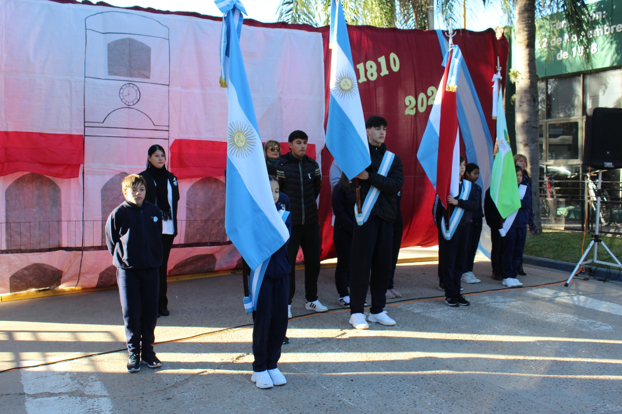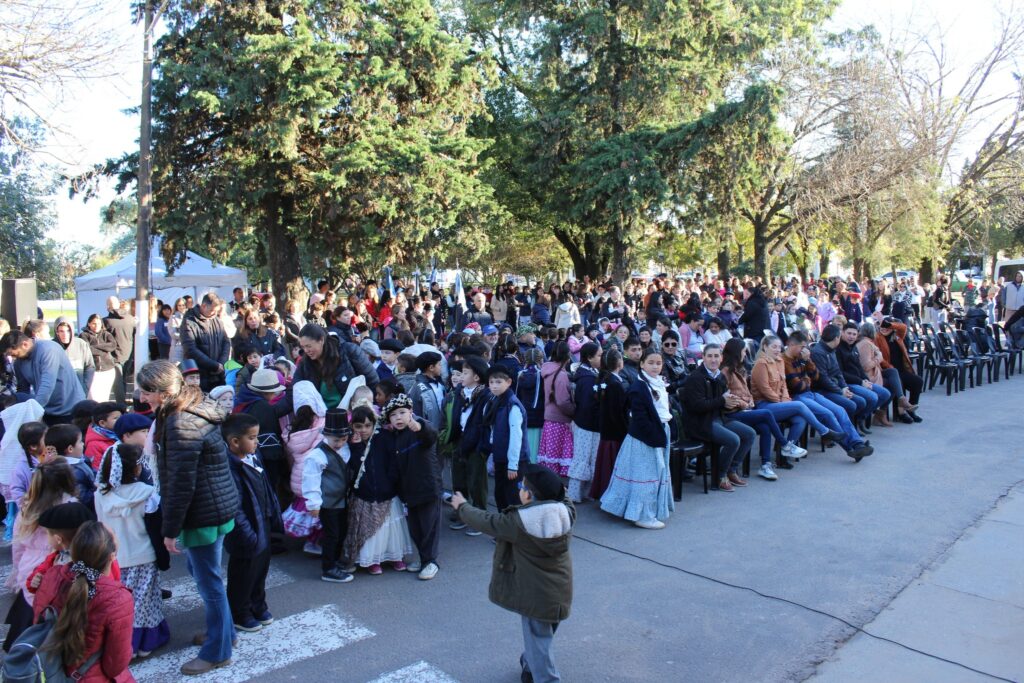 Las camperas, las pilchas gauchas y los colores celestes y blancos dibujaban el paisaje de una mañana tan despejada —con su sol de Mayo— como fría, con una temperatura que rondaba los 8°C. Después de unas palabras alusivas a la jornada de la Revolución de Mayo, que incluyó el discurso del intendente Ricardo Sandoval, se hicieron presentes los chicos con las banderas de ceremonias para entonar las estrofas del Himno Nacional y la Marcha de Entre Ríos.