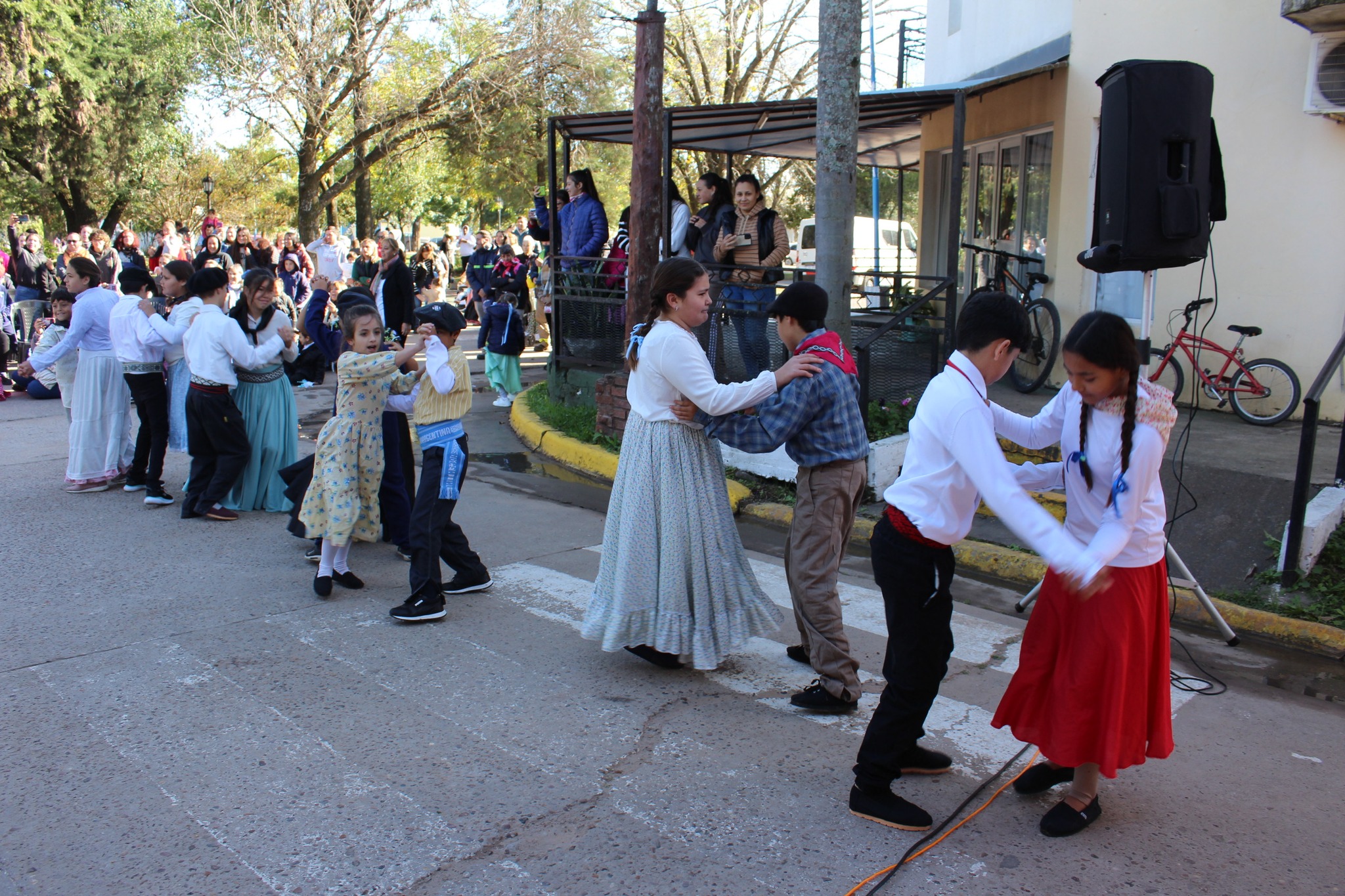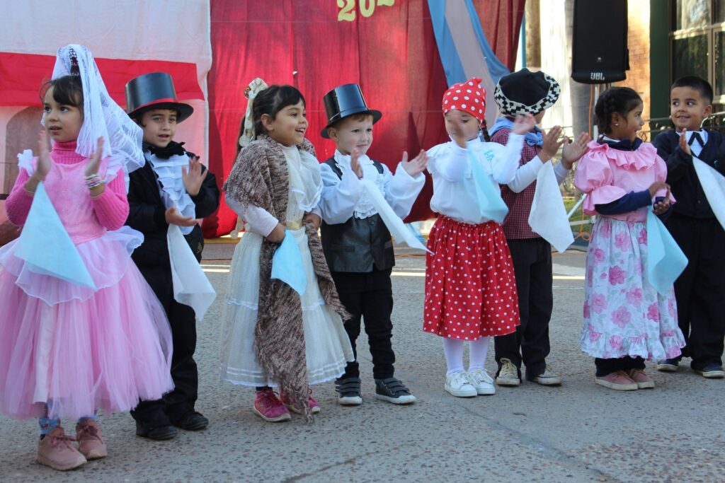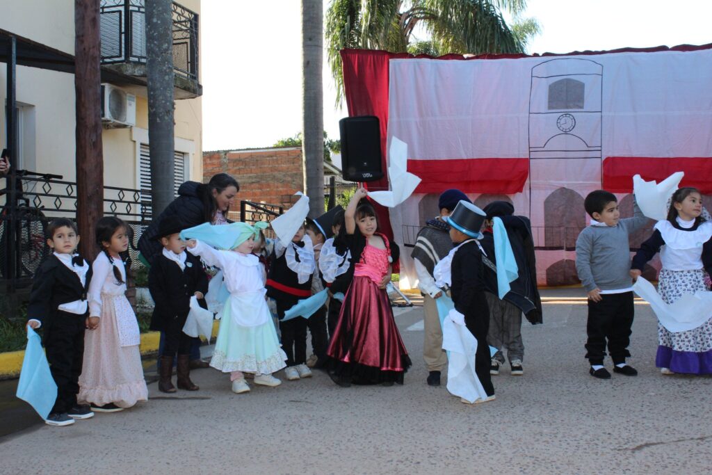 Toda la formalidad hasta que empezaron a desfilar los gurises. Uno a uno, grado a grado, desde el nivel inicial hasta Sexto Grado, demostraron en escena lo aprendido para esta fecha patria: historias sobre la semana de mayo, coplas recitadas por un par de gurises, la guitarra del profesor y las danzas tradicionales… mucho baile al compás del ritmo que marcaban las maestras.