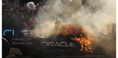 Yuki Tsunoda protagonizó un incendio con el monoplaza RB7 durante un espectáculo de Red Bull en San Francisco el sábado, en plena exhibición callejera y ante cientos de espectadores. El piloto japonés manejaba el histórico auto campeón de 2011 cuando el vehículo comenzó a prenderse fuego en la zona trasera, en el sector de Marina Boulevard.