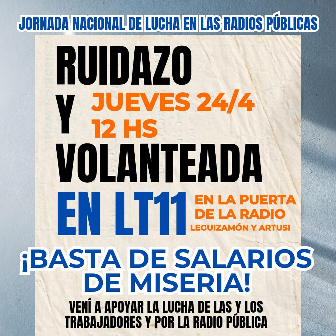 Este jueves al mediodía, trabajadores y trabajadoras de la emisora LT11 de Concepción del Uruguay se movilizarán en las puertas de la radio como parte de una jornada nacional de protesta que se replica en todas las emisoras de Radio Nacional del país. La medida, convocada para las 12 horas, incluirá un ruidazo y una volanteada con el objetivo de visibilizar una serie de reclamos vinculados a sus condiciones laborales, salariales y la situación de los medios públicos.