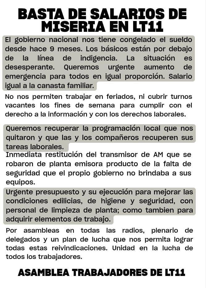 Otro de los puntos clave del reclamo es la restitución del transmisor de AM, cuya ausencia afecta la llegada de la radio a numerosas zonas del departamento Uruguay y regiones vecinas. Además, se exige la mejora de las condiciones edilicias de la sede de LT11, así como aspectos vinculados a la seguridad y la higiene en el ámbito de trabajo.