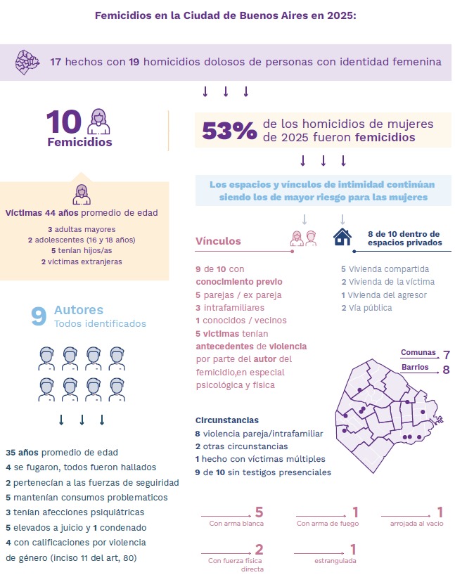 El informe oficial registró 19 homicidios dolosos de mujeres durante 2025 en territorio porteño. Los investigadores identificaron indicadores de violencia de género en 10 de esos casos. Los especialistas calificaron esos hechos como femicidios y señalaron que la violencia por motivos de género continúa como la principal causa de muertes intencionales de mujeres en la ciudad.