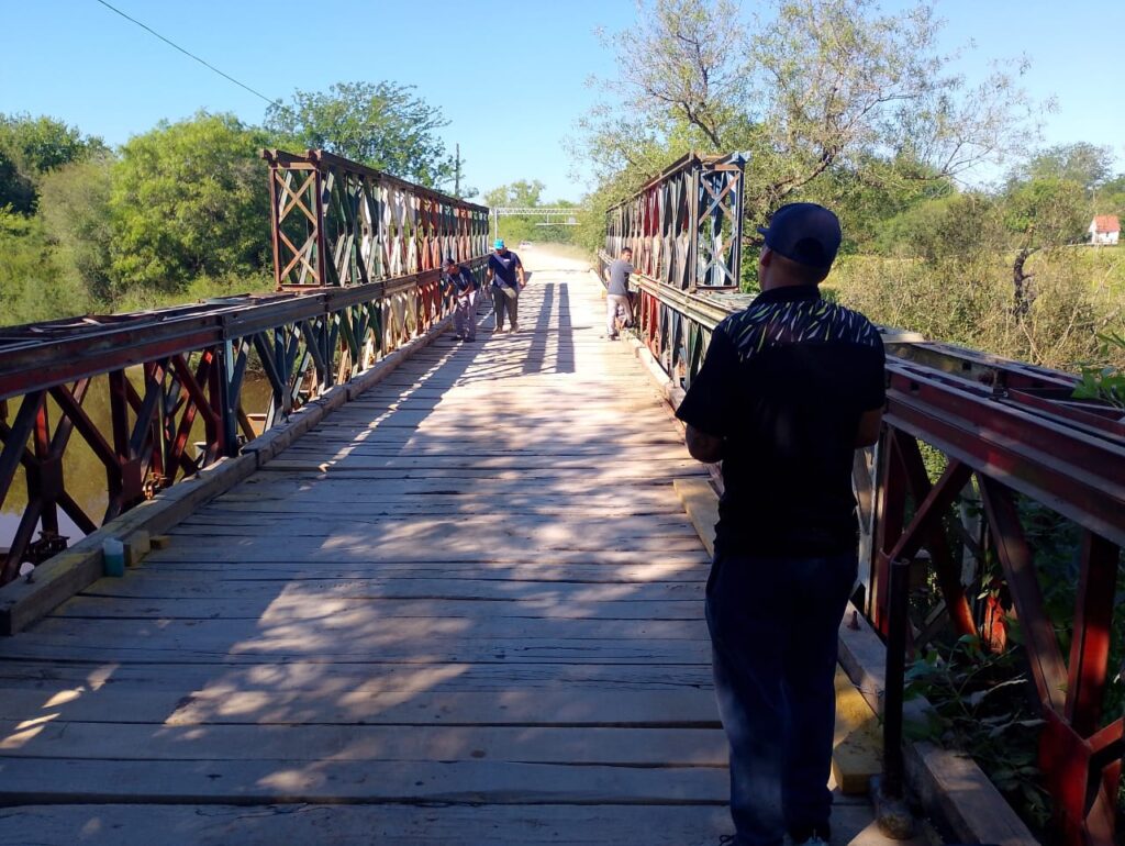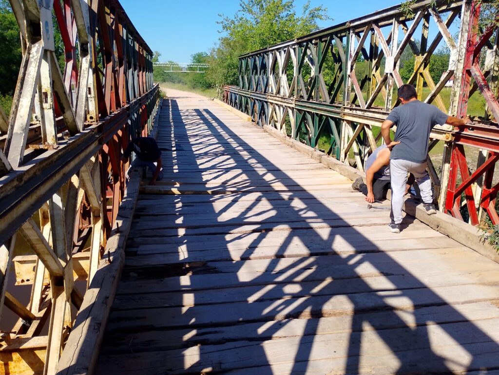 El municipio reemplaza los tablones rotos y los cordones transversales, y coloca una lámina plástica con broza para proteger la base del puente. Estas tareas buscan devolver estabilidad a la estructura y mejorar la circulación en un punto muy transitado por vehículos livianos y pesados.
