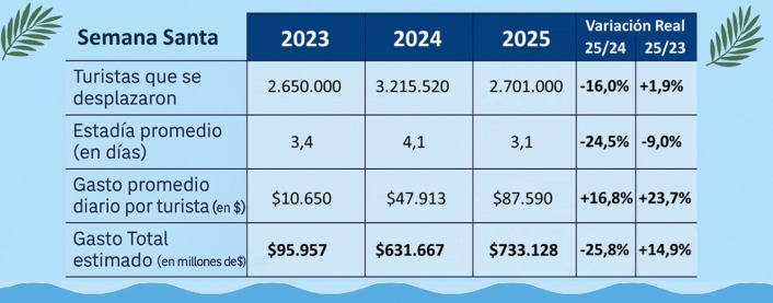 Aunque los números fueron algo más bajos que en 2024 —año en el que Semana Santa coincidió con el feriado del 2 de abril y duró seis días—, los resultados fueron considerados dentro de lo esperado. La cantidad de turistas bajó un 16% respecto al año pasado, pero el gasto promedio fue mayor: en 2023, los visitantes habían desembolsado $10.650 diarios, frente a los $87.590 de este año. Medido a precios constantes, el impacto económico fue un 14,9% superior al de 2023.