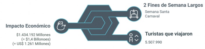 Con este segundo fin de semana largo del 2025, ya son más de 5,5 millones de turistas los que viajaron por el país en lo que va del año, generando un movimiento económico de $1,4 billones (unos 1.261 millones de dólares).