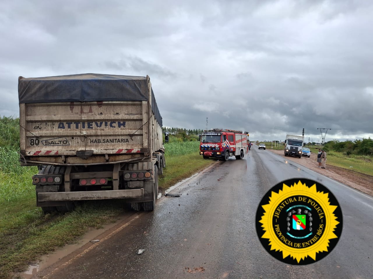 El conductor del MB, un hombre de 37 años de Gualeguaychú, relató que viajaba acompañado por un compañero de trabajo, de 24 años, cuando sufrieron el impacto que terminó con su vehículo despistado sobre la banquina norte de la ruta.
