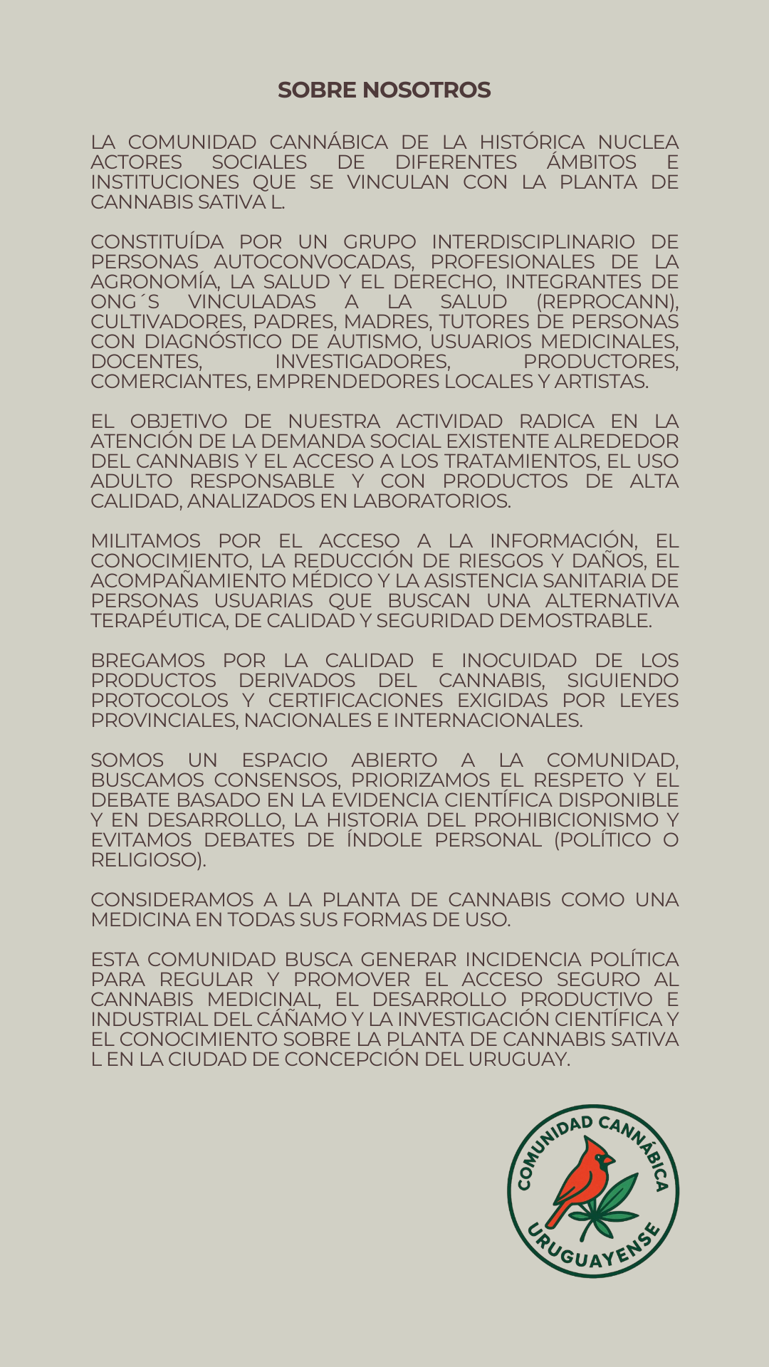 La Comunidad Cannábica, organizadora del encuentro, está integrada por profesionales de distintas áreas —salud, derecho, agronomía, arte y producción— además de usuarios medicinales, cultivadores y familiares de personas con autismo. Su objetivo es promover el acceso seguro a tratamientos, fomentar la reducción de riesgos y acompañar con información médica y científica el desarrollo de políticas públicas sobre cannabis.